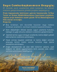 Tarım ve Orman Bakanı Vahit Kirişci, sosyal medya hesabından yaptığı paylaşımda, “81 ilimizde tarım arazilerinin etkin kullanımı ile bitkisel üretimin geliştirilmesine yönelik projeler başlatıyoruz. Proje kapsamında belirlenen yatırım konularında, il/ilçe Tarım ve Orman Müdürlüklerimizce hazırlanan projelere, toplam proje bedelinin azami yüzde 75’ini Bakanlığımızca hibe olarak vereceğiz. Proje ile boş bırakılan, atıl durumda bulunan veya nadasa bırakılan arazilerin, tarımsal üretime kazandırılması. İklim değişikliğini dikkate alarak, uygun çeşitlerle hububat, baklagil ve yağlı tohumlu bitkilerin üretiminin geliştirilmesi. İşlemeli tarıma uygun olmayan arazilerde, katma değeri yüksek bitki türlerinin Üretiminin artırılması. Hasat sonrası kayıpları azaltmak ve katma değeri artırmak amacıyla birincil üretim sonrası kurutma veya isleme tesislerinin artırılması ve doğal ekolojilerinde var olan bitki türlerinin aşılama, çeşit değişimi ve benzeri teknik uygulamalarla birim alandan elde edilen veriminin artırılması hedefleniyor.” ifadelerini kullandı.