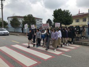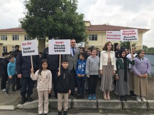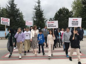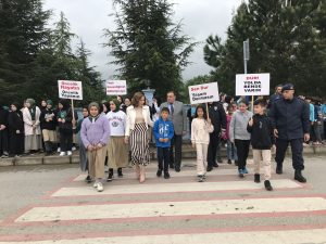 Öğrenciler, sürücülerden yayalara ve okul çıkışlarında çocuklara yol vermeleri istedi. Trafik polis görevlileri araçlara broşür dağıtırken sürücüleri yayalara karşı duyarlı olmaya davet etti.